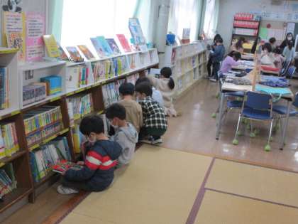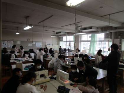 午前中には、図書室で、1年生が本を借り読んでいる様子が見られました。また、家庭科室では6年生がミシンの学習に励んでいました。