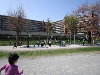 中休みには、芝生、遊具、そして、グラウンドで大勢の児童が汗をかきながら気持ちよさそうに遊んでいました。