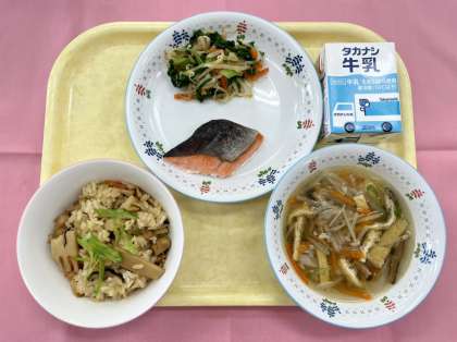 今年のたけのこは、なんと東京産でした。とれたて新鮮です。きのうのうちから調理員さんが丁寧に下処理をしてくださったおかげで、穂先は柔らかく、根元はシャキシャキのおいしいたけのこごはんが仕上がりました。今の時季にしか味わえない、姫皮もしっかり使用しました。おかわりしてくれた児童も多く、嬉しかったです。