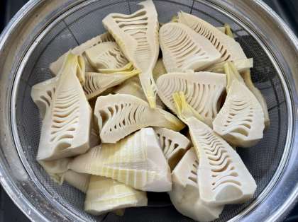 毎年4月のイチオシ献立といえば、「たけのこごはん」です。給食ではふだん、水煮のたけのこを使用していますが、旬のこの時季だけは、生のたけのこを使用してたけのこごはんを作ります。