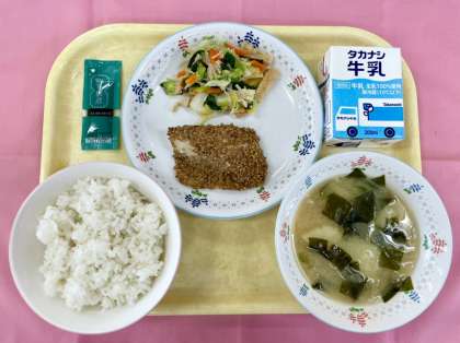 今日は旬の春キャベツを使って煮浸しを作りました。煮浸しは本来、だし汁で野菜などをさっと煮て作りますが、給食では衛生面から「さっと」調理することは難しいため、油揚げとえのきたけをだし汁で煮て、別にボイルした野菜と和えて仕上げました。そうすることで、色良く、食感も良く仕上がったと思います。だしの味をよく含んだ油揚げが味のアクセントになりました。