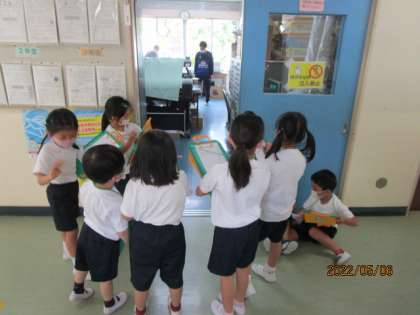 一方、1年生は、学校内の探検をしていました。一生懸命、印刷室などの様子を観察してメモしていました。