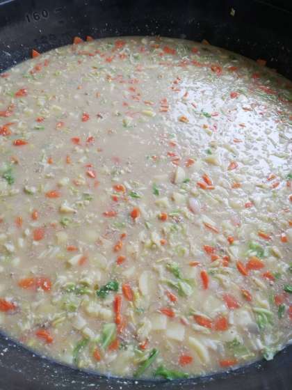 ポテトのみそバター煮は、鶏がらでとったスープで玉ねぎや人参、ひき肉、じゃがいも、キャベツなどを煮込み、みそで味を調えます。仕上げにバターを加えて香りを出すのがポイントで、みそバターラーメンのような食べやすい味です。
