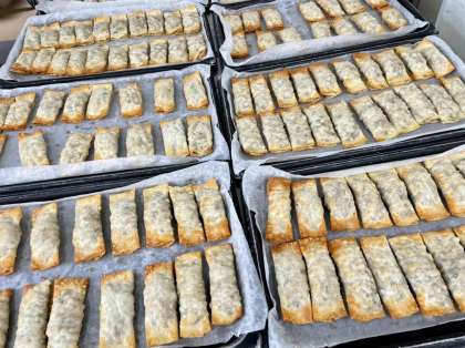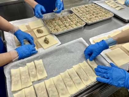 今日の給食では、キャベツやねぎ、ニラ、椎茸などたっぷりの野菜と豚ひき肉を混ぜてタネを作り、四角い餃子の皮でくるんでオーブンで焼き上げました。
