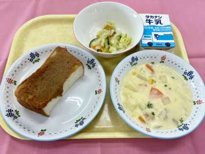 今日は今年度はじめてトーストを焼きました。給食の調理パンには色々なレパートリーがありますが、今回はきなこペーストを厚切りの食パンに塗って焼き上げた「きなこトースト」です。きなこペーストは、マーガリンにきなこと砂糖を混ぜて作りました。児童からとても好評で、普段苦手な食べ物が多い子からも「今日のパンおいしかったよ!!」と声をかけてもらえました。