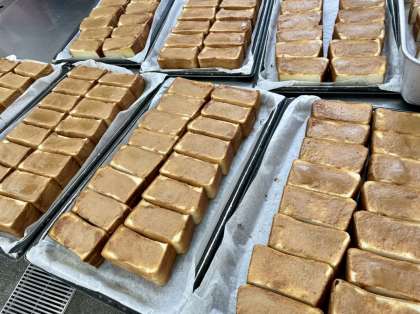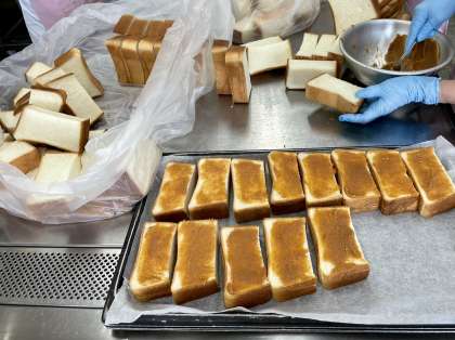 調理パンはどうしても冷めると硬くなってしまうのですが、厚切りのパンを使うことで外はカリカリ中はふわふわの状態で提供することができます。数年前、わたしが鶴間小に異動してきて初めて厚切りトーストを食べたとき、見た目のインパクトと食感にとても感動したのを覚えています。写真だと伝わりにくいかもしれませんが、高学年用のパンは4枚切よりも厚みがあります。