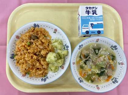 今日は、チキンライスを作りました。鶴間小のチキンライスは、具とごはんを別々に作り、最後に両方を混ぜ合わせて仕上げています。具を調理したときの煮汁とガラスープを、ごはんを炊くときに加えているので米粒ひとつひとつに味が染みていてとてもおいしいです。仕上げに加えるバターのおかげで、ほのかにバターの香りがするのもポイントです。今日もみなさんよく食べてきてくれました。