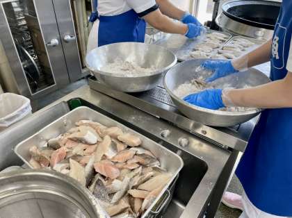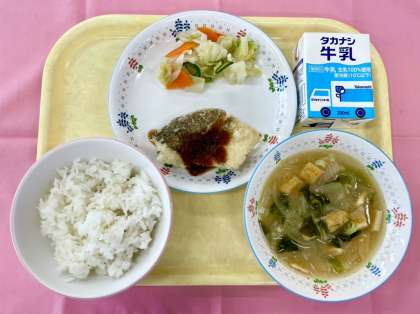 魚のバーベキューソースは、でんぷんをつけて揚げた白身魚に、手作りのバーベキューソースをかけた料理です。このバーベキューソースは、しょうゆベースの調味料に玉ねぎとりんごのすりおろしを加えてあり、白いごはんによく合う味付けです。和食は、やはり白いごはんとおかずの相性がとても大切なので、白いごはんの献立の日は、出来る限りごはんと相性の良い主菜を合わせられるように心掛けています。