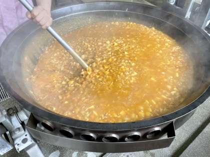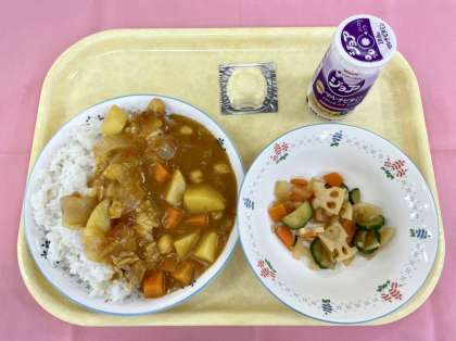 今日は、運動会に向けて毎日練習をがんばる児童への応援の気持ちを込めて、「ガルバンゾーカレー」を作りました。
