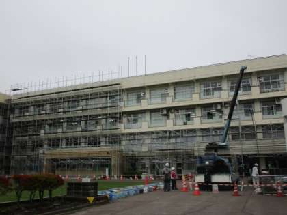 中央校舎の南側の足場もかなり高い位置まで組まれ、間もなく、北側のように全面が覆われることでしょう。