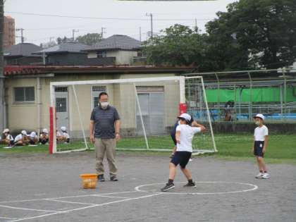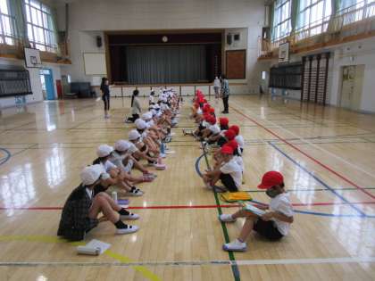 低学年と高学年の児童がペアになり、高学年の児童がリードしながらテストの種目に取り組みました。微笑ましかったです。