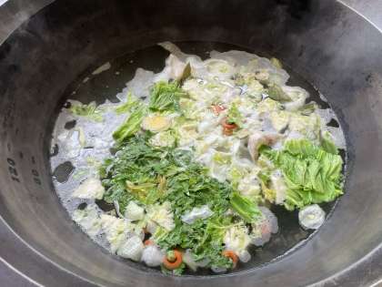 今日のような洋食の日は、鶏がらに玉ねぎや人参、キャベツのような野菜と、セロリやパセリなどの香味野菜を加えてスープを取ります。同じ鶏がらスープでも、中華料理などのときは長ねぎやしょうが、にんにくなどを加えることでスープの味も変わります。