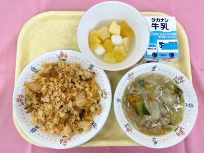 夏になるとどうしても食欲が落ちてくるので、香辛料を加えたピリ辛メニューや、さっぱりとしたメニュー、喉ごしが良い食材などを意識して取り入れています。キムチチャーハンやはるさめスープは、6月中旬からの気候を見据えて取り入れたメニューでした。そして、よく冷やした白玉ポンチも今日のような日にぴったりで、児童のみなさんが喜んで食べてくれたので良かったです。春から夏に出回る夏みかんは、生のものは酸味と苦味があるので苦手な子も多いですが、シロップ漬けだと気にせず食べられたようです。