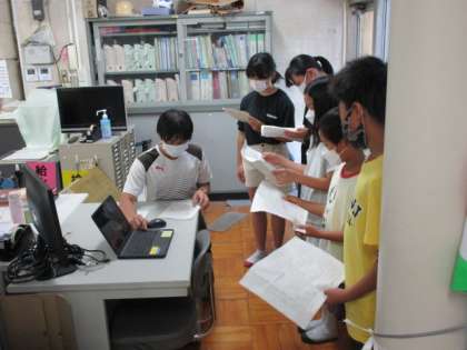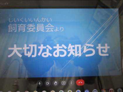 全校朝会の校長講話の後、飼育委員会が、meetを用いてウサギについて発表しました。