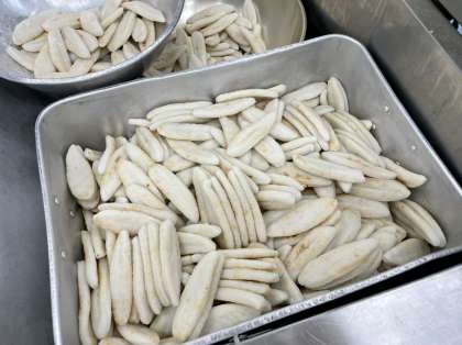 今日は7月7日七夕です。七夕といえば短冊、短冊といえば笹ということで、今日は笹かまぼこの天ぷらを作りました。笹かまぼこは、本場宮城県で製造されたものを使用しました。実はわたしはこれまで本場宮城の笹かまぼこを食べたことがなかったのですが、今日はそのおいしさに感動。ふっくらしていて、食感はプリッとして、塩加減と甘みのバランスがよく、これは児童にぜひ食べてもらいたい!と心から思いました。