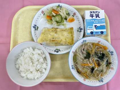 今日は、ビーフンスープを作りました。ビーフンは米を原料として作られる麺で、中国や台湾、ベトナムなどの東南アジアでよく食べられています。炒めて焼きビーフンにするほか、今日の給食のようにスープに入れたり、サラダにして食べる国もあるそうです。