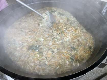 今回のビーフンスープは、調理員さんに教えていただいたかつおだしベースの味付けでした。それまで、ビーフンのイメージから、なんとなく鶏がらスープの方が合うのかと思っていましたが、昨年度実施してみたところかつおだしとビーフンの相性がよく、とてもおいしく仕上がりました。そうめんスープともはるさめスープとも違う独自のおいしさです。今日も好評でした☆