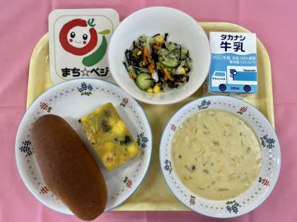 オムレツには、トマト、枝豆、玉ねぎ、じゃがいも、チーズ、町田市産のなすが入っているので、ボリュームたっぷりの仕上がりでした。朝食レシピコンテストの受賞レシピは、クックパッドの「簡単!★町田市の給食」のキッチンで公開しておりますので、よろしければご覧ください。