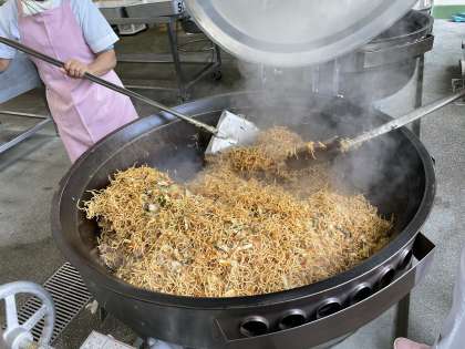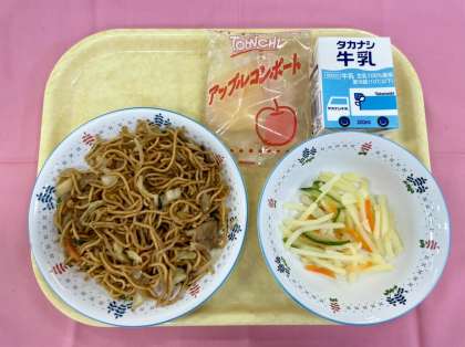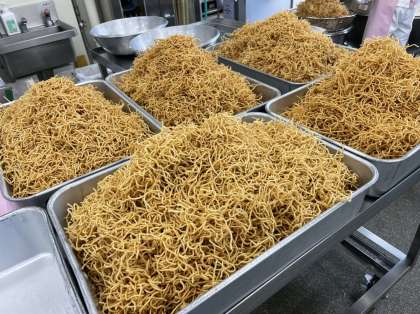 給食の焼きそばは、一度麺を油で揚げてから、ソース味に炒めた具と合わせます。野菜から出たうまみたっぷりの水分と調味料を、カリカリの麺が吸収しておいしい焼きそばが出来上がるのです。おうちで作る焼きそばと一味違う大量調理ならではの味に、子供も大人も喜んでくれていました。