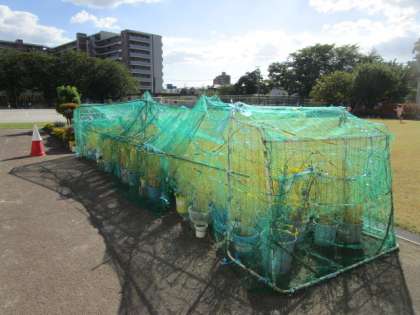 用務員さんが、バケツ稲にネットをかけてくださいました。