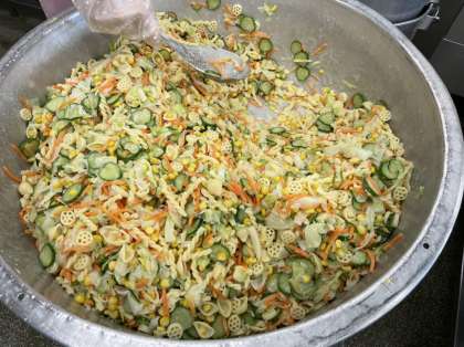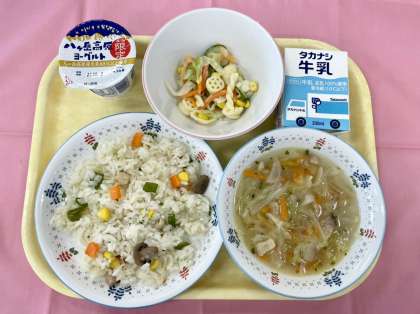 パスタサラダは、鶴間小では昨年度初めて実施したメニューです。調理員さんの「色々なパスタを入れよう!」というアイディアを参考に3種類のパスタを使用したところ、見た目がかわいらしく、ドレッシングとの絡みも絶妙なおいしいサラダが出来上がりました。3種類のパスタは、車輪の形のホイールマカロニ(ルオーテ)、らせん状のカールマカロニ(フジッリ)、貝殻の形のシェルマカロニ(コンキリエ)です。それぞれ茹で時間が違うので、今日も調理員さんが時間差をつけてボイルしてくださいました☆