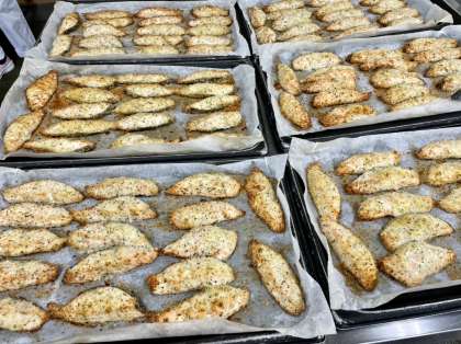 今日は、秋の味覚のひとつ鮭を使って、香草パン粉焼きを作りました。パセリ、パン粉、パルメザンチーズを混ぜ、オリーブオイルをまぶした鮭につけてオーブンでこんがり焼きました。鮭に多く含まれるビタミンDは、カルシウムの吸収を助け、骨を強くする働きがあるので、鮭と乳製品の相性はピッタリです。