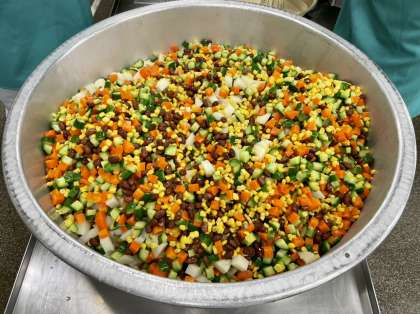 マセドアンサラダは、材料をコロコロに切って仕上げるサラダです。じゃがいも、きゅうり、にんじんをコロコロに切り、コーンとえんどう豆と一緒に和えました。彩りがとてもきれいに仕上がりました。