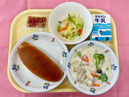 タイムスリップ給食最終日の今日は、戦後から昭和40年代にかけて主流だったコッペパンの献立でした。戦争が終わり、食糧などが不足していた中、アメリカから輸入した小麦粉と脱脂粉乳を使用した給食が学校で提供されるようになりました。ほぼ毎日コッペパンが登場し、シチューやくじらの竜田あげ、コロッケなどと共に食べられていたそうです。現在でも人気メニューの揚げパンは、昭和29年に、かたくなったコッペパンを揚げて砂糖をまぶしたのがその始まりと言われています。