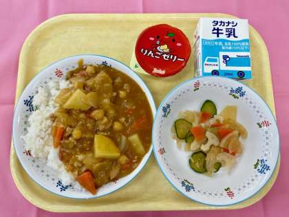 2月2日の給食 公開日 2023/02/02 更新日 2023/02/02 給食室より 牛乳 ひよこ豆のカレーライス 手作り福神漬け りんごゼリー 今日はひよこ豆のカレーを作りました。給食では大豆や小豆のほかにも、えんどう豆やひよこ豆、いんげん豆、ときどきレンズ豆など様々な豆を使用します。豆には食物繊維や色々な栄養素が含まれており、ボリュームもアップするので成長期の子供たちにおすすめの食材です。 明日は節分なので、大豆の加工品のひとつである打ち豆を使用します。 給食室より