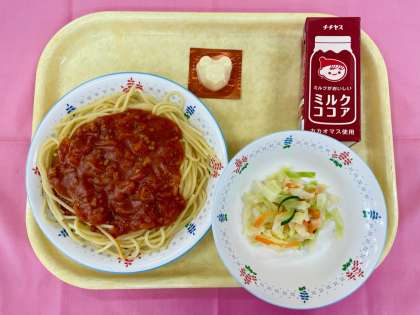 今日は、12月に行った好きな給食(食べたい給食)アンケートで上位に輝いたスパゲッティミートソースと、ミルクココアの献立でした。珍しい組み合わせの給食に、ずいぶん前から今日を楽しみにしてくれていた児童も多く、展示食を出す前から給食室の前まで様子を見に来てくれる子もいました。