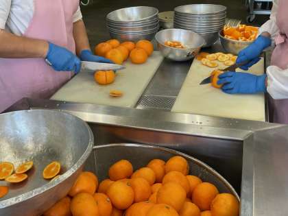 ひとつめは、青森県産青天の霹靂について。2学期の新米フェアで使用し、子供からも大人からも好評だったお米をもう一度使ってごはんを炊きました。粒が大きく、しっかりとした粒感が特徴のお米です。適度にもっちりとして、みずみずしくなめらかな舌触りのごはんが炊けました。