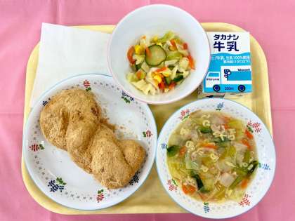 今日は、好きな給食アンケートで、パン部門1位を獲得したきなこあげパン、スープ部門1位を獲得したABCパスタスープが登場しました。子供からも大人からも大人気のメニューだったので、朝からたくさんの人たちに嬉しい言葉をかけてもらいました。