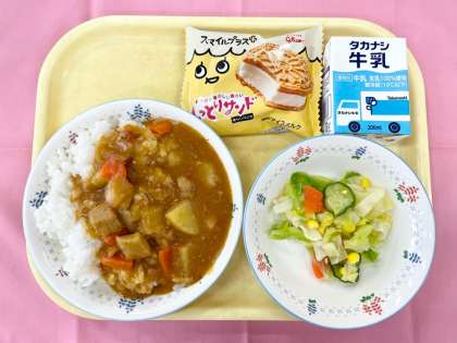 いよいよ今年度最後の給食の日を迎えました。最終日の今日は、好きな給食アンケートごはん部門堂々一位のカレーライスと、デザート部門第一位のアイスクリームが登場しました。カレーライスは、今日も調理員さんが豚の肩肉を朝からじっくり煮てくださり、ホロホロの柔らかい仕上がりでした。いつもながら給食のカレーは本当においしいなと思います。