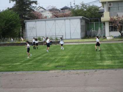 用務員さんがきれいに芝生を刈ってくださり、早速、その上で運動に親しむ姿が見られました。