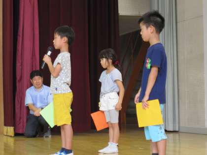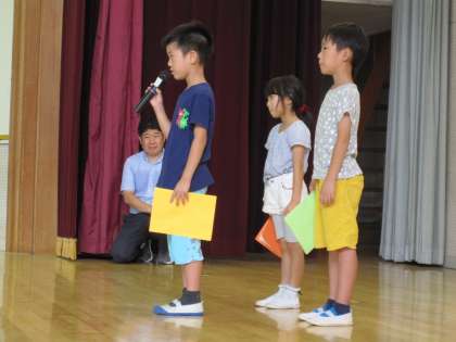梅雨明けが待ち遠しいこの頃です。今日は2年生の代表児童が発表しました。「字をていねいに書くことを頑張りました。」「漢字の練習ではお手本みたいに、きれいに書きました。」「算数が分かるようになりました。一人で繰り下がりができるようになりました。」等々、成長した自分を振り返りました。