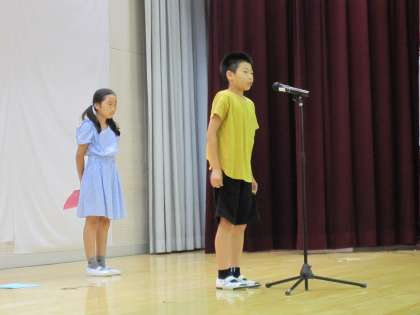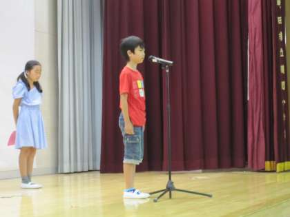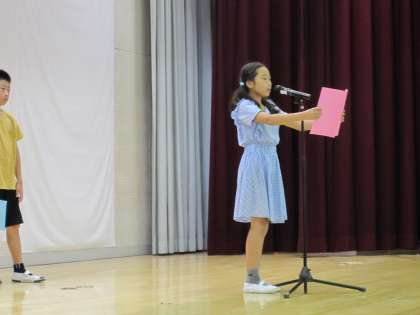 代表は4年生です。「難しい漢字や計算に挑戦する」「友達と仲良くなる」「学校だけでなく、家でも勉強する」「作品展では驚くような作品を仕上げる」「クラスみんなで助け合う」など、頼もしい目標を発表しました。