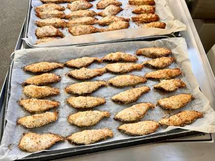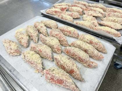 今日は、秋の味覚「秋鮭」を使って香草パン粉焼きを作りました。白ワイン、塩、こしょうで下味をつけた鮭にオリーブオイルをまぶし、パルメザンチーズとパセリ、パン粉をつけてオーブンで焼きました。鮭に多く含まれるビタミンDは、チーズなどの乳製品に含まれるカルシウムの吸収を助けて骨を強くするのに役立ちます。