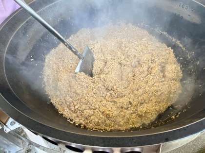 にんにく、しょうが、豆板醤で香りを出してから鶏ひき肉を炒め、今回は具として切干大根を細かく切ったものも加えました。しょうゆやみりんで調味し、ひきわり納豆を加えて炒めます。納豆は火を通すことで粘りが弱くなり、香りがマイルドになるのと同時に給食当番の子供たちが配膳しやすくなります。