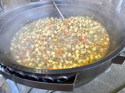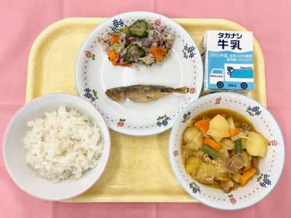 カレー肉じゃがは、ふつうの肉じゃがにカレー粉を加えた進化系の肉じゃがです。カレー粉の風味が食欲をそそり、白いごはんによく合うおかずです。給食の大釜で作る煮物料理は、それぞれの食材のうまみがよく出て、味の染み込みも良く、とてもおいしく仕上がるので、今日も皆さんよく食べてくれました。