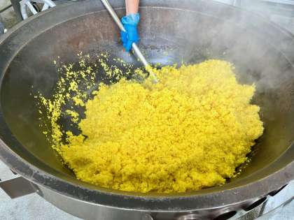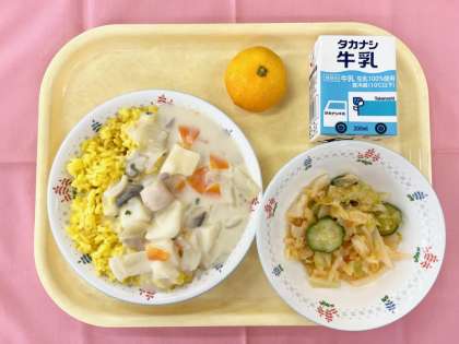 子供たちの反応を見るために低学年と中学年の教室を見に行ったのですが、たくさんの児童が「おいしい!」とおかわりをしてくれていました。見た目と食べやすさを考えてターメリックライスと組み合わせてみたのですが、カレーのようにサラサラと食べられたようです。久しぶりに世界の料理の新メニューにチャレンジしたので、概ね好評だったようで安心しました。