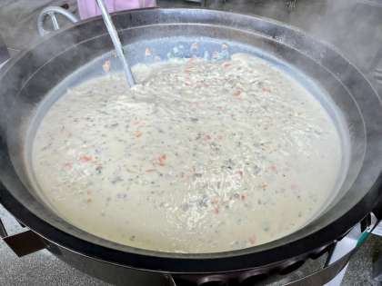 日本では、4年前に大手牛丼チェーン店が季節限定メニューとして「シュクメルリ鍋」を販売したところ、その今までに無いおいしさに人気が集まり、「世界で一番にんにくをおいしく食べるための料理」として話題になりました。わたしも初めてシュクメルリを食べたときからその味の虜になり、度々自宅で作りながら「いつか給食で再現できたらな」と思っていたので、試作をしながら今回初めて給食に取り入れてみました。