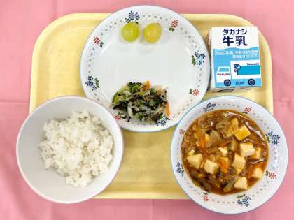 今日は、もともと東京で生まれたぶどうの品種「高尾」を使用する予定でしたが、今年の暑さの影響で高尾の収穫量が非常に少なく給食で使用するだけの量を確保できないとのことで、果物のぶどうはシャインマスカットに変更になりました。