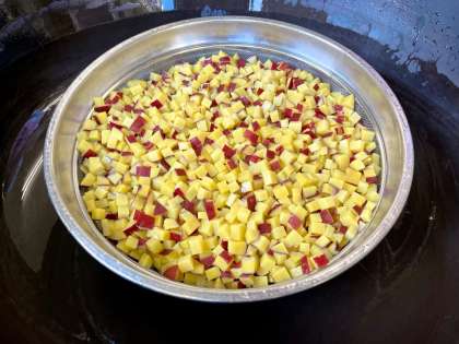 今日は、農家の佐藤さんが育ててくださった町田産のさつまいもを使って蒸しパンを作りました。コロコロに切ったさつまいもを茹でてから使用したのですが、黄色くホクホクとして、それだけでもおいしそうでした。今回の蒸しパンは、小麦粉ではなく米粉で作ったので、もちもちとした食感が好評でした。
