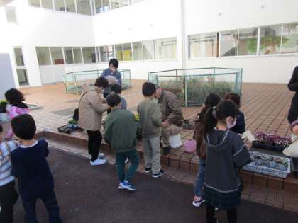 1年生が花の苗をお花屋さんから購入し、植える学習をしました。