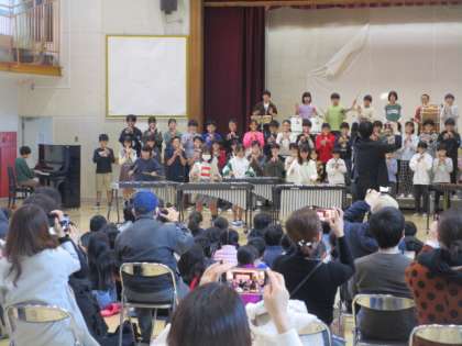 児童集会の時間に、連合音楽会に出場する5年生が、そこで発表する合唱と合奏を披露してくれました。