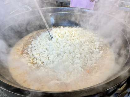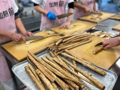 そして、今日のおかずは旬の野菜が目白押しの内容でした。農家の佐藤さんが育ててくださった大根を44kgも使った大根のそぼろ煮と、いつも人気のごぼうチップスです。