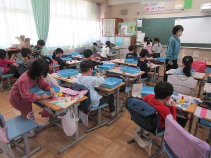 1年生は、木の実を使った工作に取り組みました。ボランティアコーディネーターの方に、集めていただいた自然の素材を用いて、ゲストティーチャーの皆様にお手伝いいただきながら、自由な発想で作品を仕上げていきました。