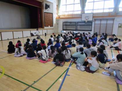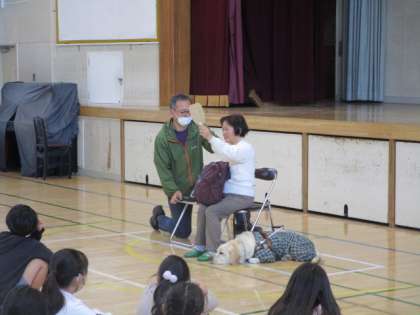 最近、4年生が総合的な学習で、障害について学んでいます。今日は、盲導犬とともに生活をされている目の不自由な方をゲストティーチャーとしてお招きし、経験談を伺いました。