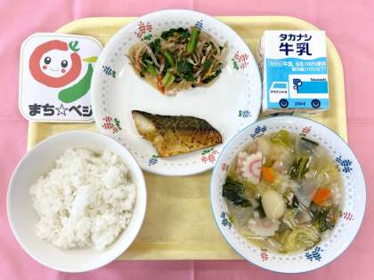 鶴間小では、日頃から町田産の農作物「まち☆ベジ」を給食に使用していますが、今月は町田市立小学校全校でまち☆ベジを献立に取り入れる「まち☆ベジ給食の日」を実施しています。鶴間小では今日、「まち☆ベジ給食の日」の取組として町田産のお米と、農家の佐藤さんが育ててくださった大根、白菜、長ネギを使用した「まち☆ベジすいとん」を提供しました。