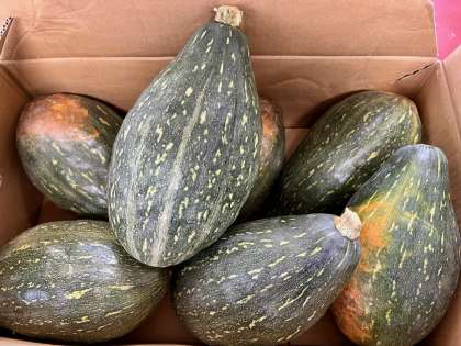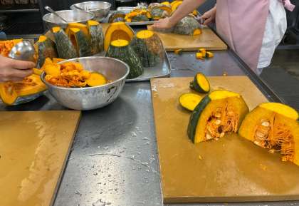 今週金曜日の冬至に向けて、今日はかぼちゃとゆずを使用した献立にしました。かぼちゃは、「万次郎かぼちゃ」というラグビーボールのような形のかぼちゃを初めて使用してみたのですが、いつもと違う形に、切るときもワクワクしてしまいました。加熱した感じはホクホクというよりはしっとりとした食感で、洋食にも合いそうな印象でした。